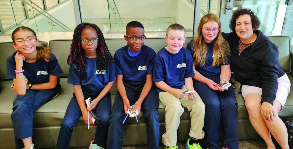 Liberty Tree Academy’s Math Club ended their inaugural year by scoring high enough to compete at the national championship at the University of Houston in Texas: left to right, Gabrielle McCollum, grade five; Precious Alande, grade three; David Akande, grade five; Theo Jacobson, grade three; Cara Ballard, grade five; and Mary Tafoya, math intervention coach.